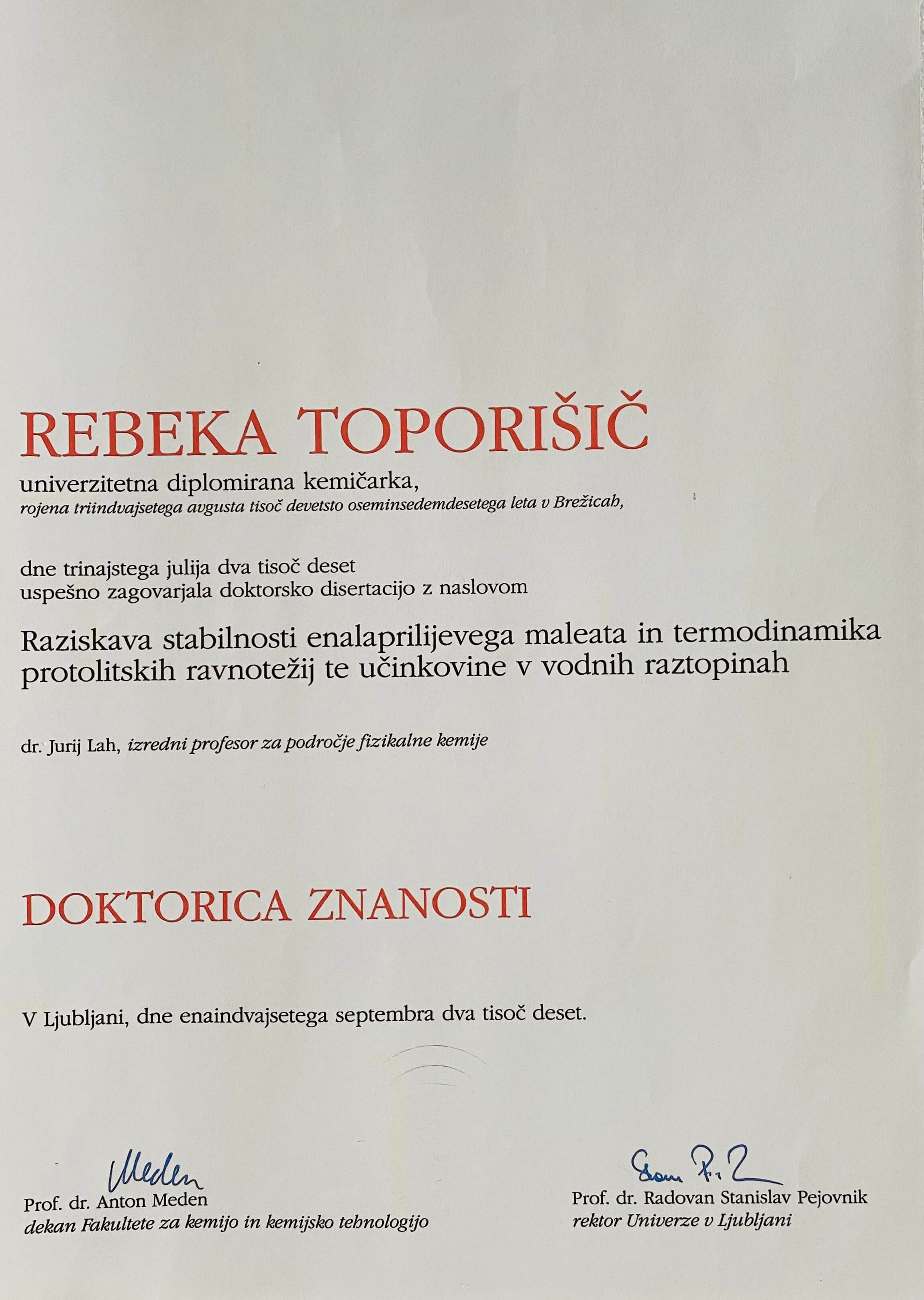 - Izkaz doktorice znanosti, 2010