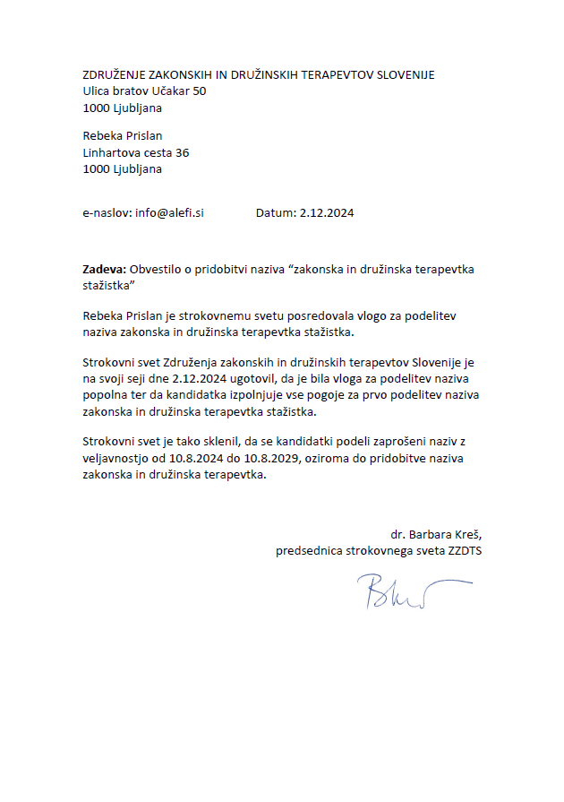 - Potrdilo naziva »zakonska in družinska terapevtka stažistka«, 2024