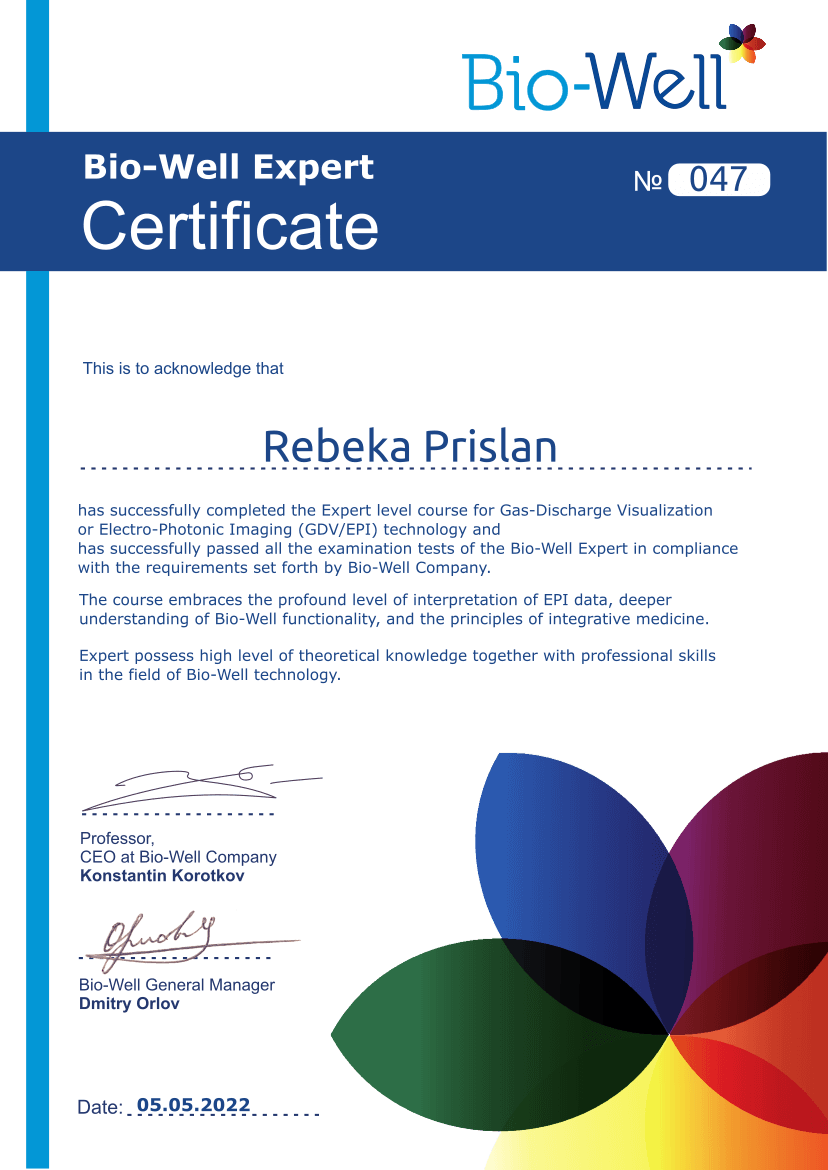 - Certifikat Bio-Well specialistke, Expert level, 2022