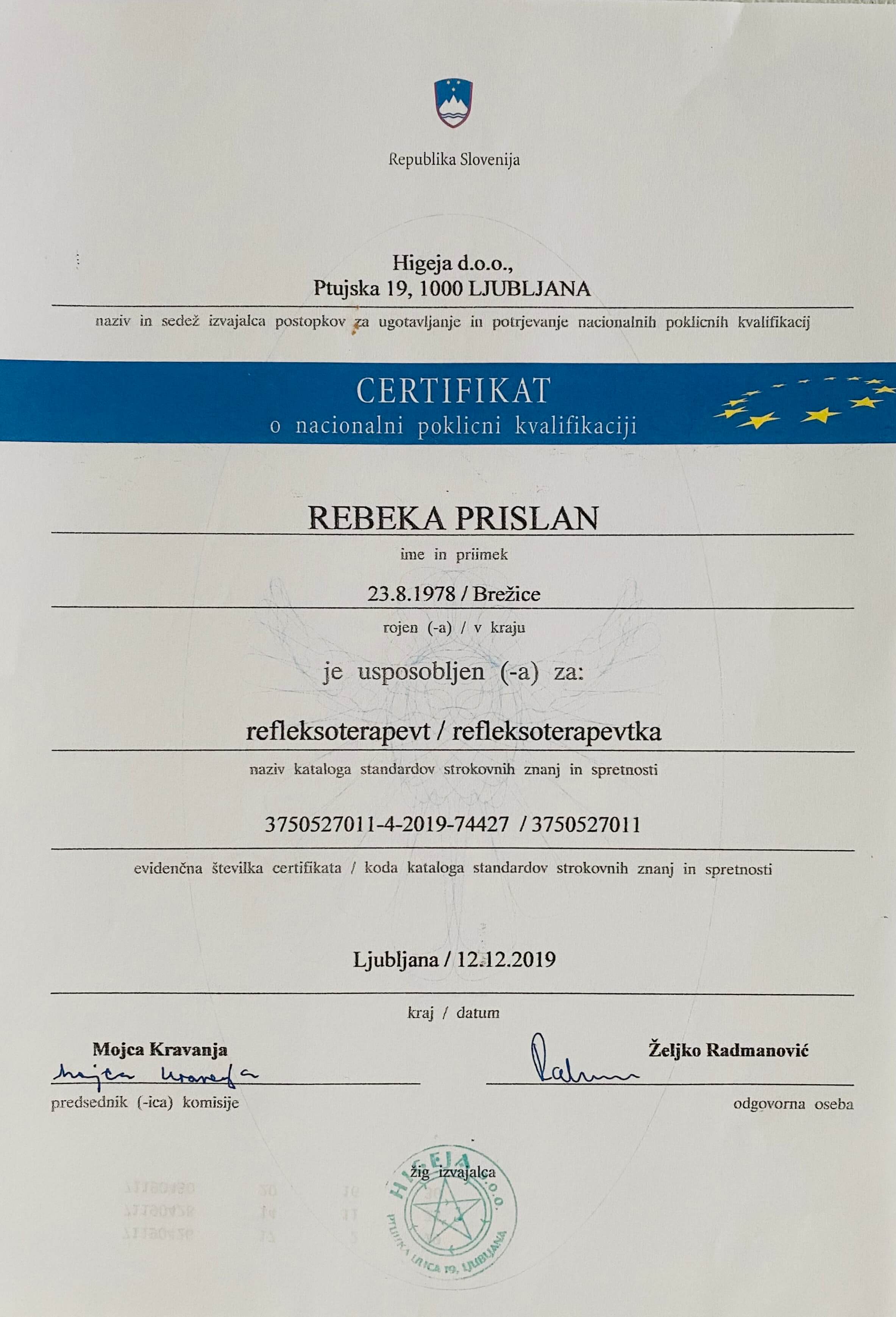 - NPK Certifikat Refleksoterapevtke, 2019