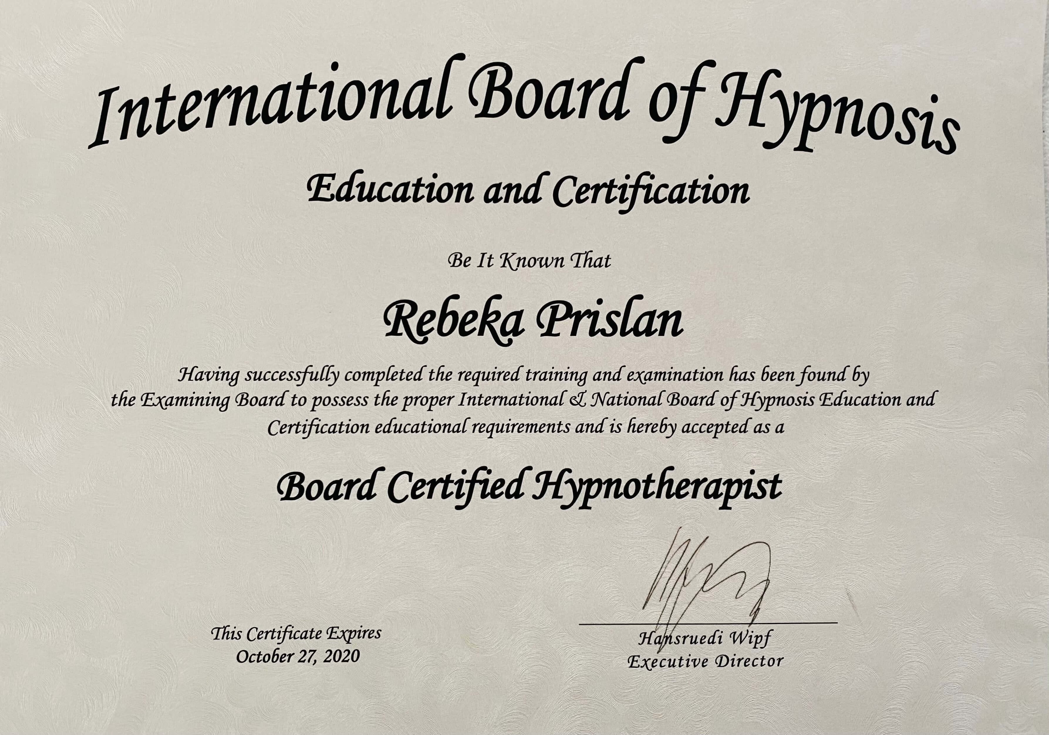 - Certifikat Hipnoterapevtke, 2020