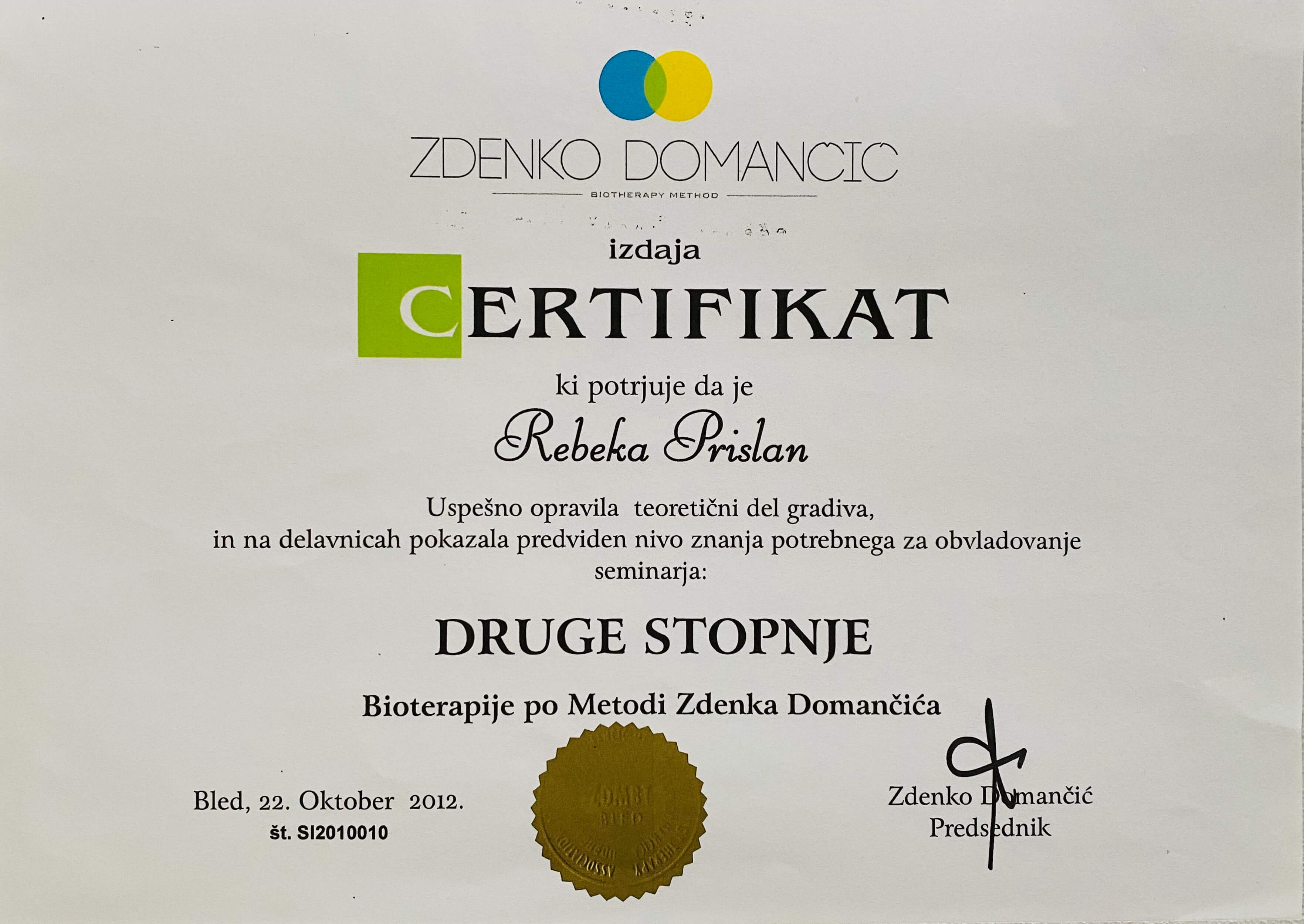 - Certifikat Bioterapevtke, 2012