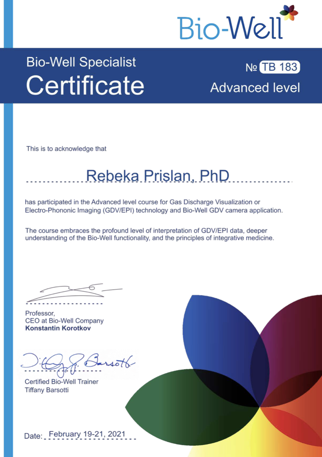 - Certifikat Bio-Well specialistke, Advanced level, 2021