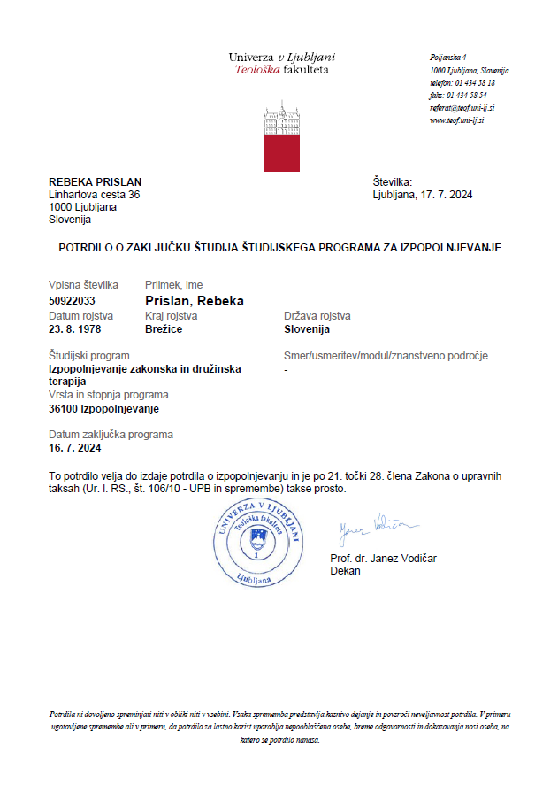 - Potrdilo o zaključku študijskega programa o izpopolnjevanju iz zakonske in družinske terapije, 2024